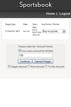 Check if the information is correct, and then enter the amount you want to wager, specify if your bet is a wager amount, risk amount or to win amount. Click continue: